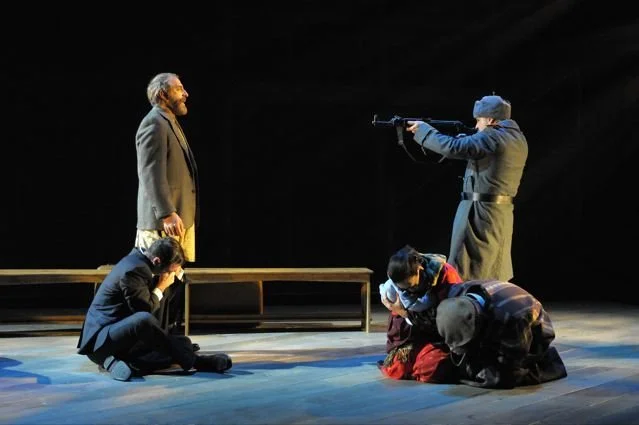 From left to right: Barzin Akhavan (Amir), Thomas Fiscella (Baba), Rinabeth Apostol (Refugee), James Saba (Refugee), Demosthenes Chrysan (Russian Soldier) (photo by Kevin Berne).